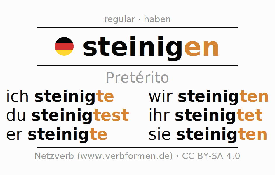 Este verbo steinigen (lapidar, apedrear) se conjuga en pretérito de la siguiente manera: ich steinigte, du steinigtest, er steinigte, wir steinigten, ihr steinigtet, sie steinigten