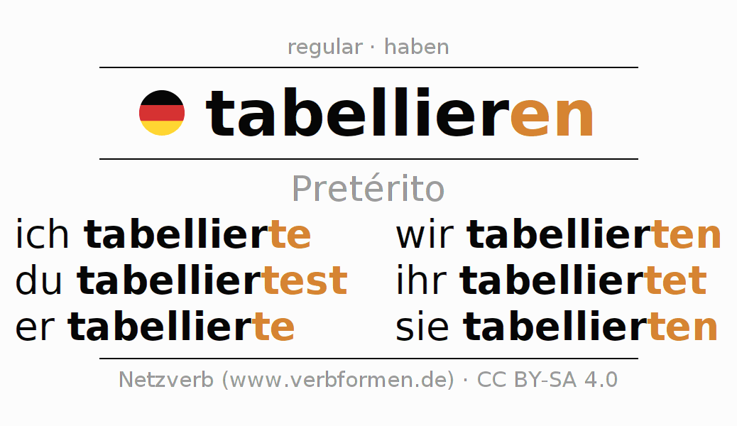 El verbo tabellieren, conjugado completamente en todas las personas y números gramaticales en Pretérito Indicativo.