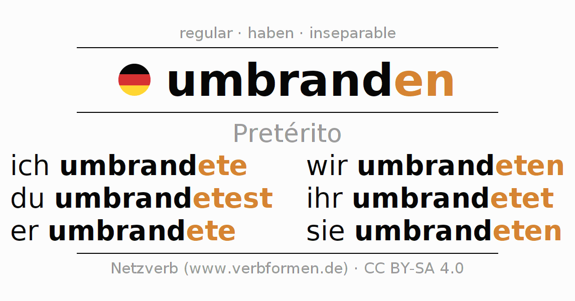 Este verbo umbranden (moverse ruidosamente) se conjuga en pretérito de la siguiente manera: ich umbrandete, du umbrandetest, er umbrandete, wir umbrandeten, ihr umbrandetet, sie umbrandeten
