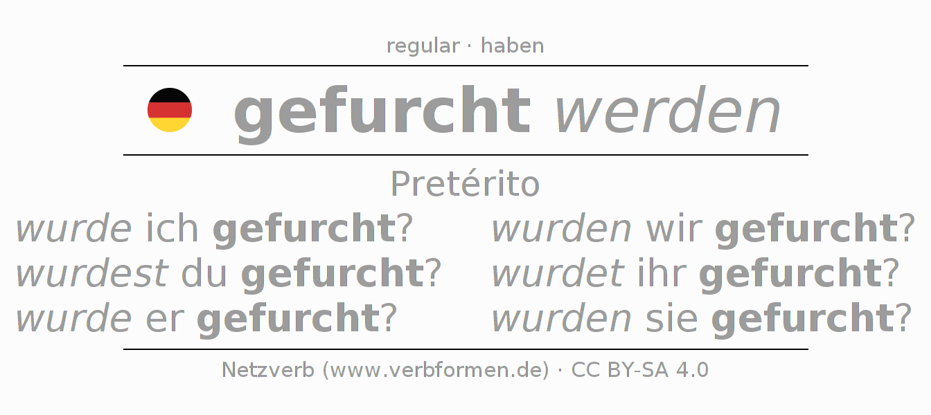 La conjugación de furchen en Pretérito Indicativo Pasado Pasivo procesivo es wurde ich gefurcht?, wurdest du gefurcht?, wurde er gefurcht?, wurden wir gefurcht?, wurdet ihr gefurcht?, wurden sie gefurcht?.Para construir esta formas se requiere seguir algunas reglas gramaticales y también las especificaciones para la conjugación de verbos simples de furchen en Pretérito . Comentarios ☆