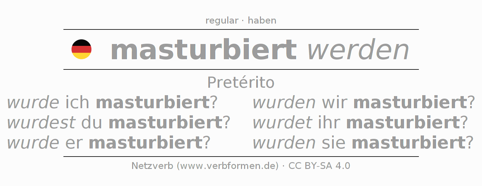 La conjugación de masturbieren en Pretérito Indicativo Pasado Pasivo procesivo es wurde ich masturbiert?, wurdest du masturbiert?, wurde er masturbiert?, wurden wir masturbiert?, wurdet ihr masturbiert?, wurden sie masturbiert?.Para construir esta formas se requiere seguir algunas reglas gramaticales y también las especificaciones para la conjugación de verbos simples de masturbieren en Pretérito . Comentarios ☆