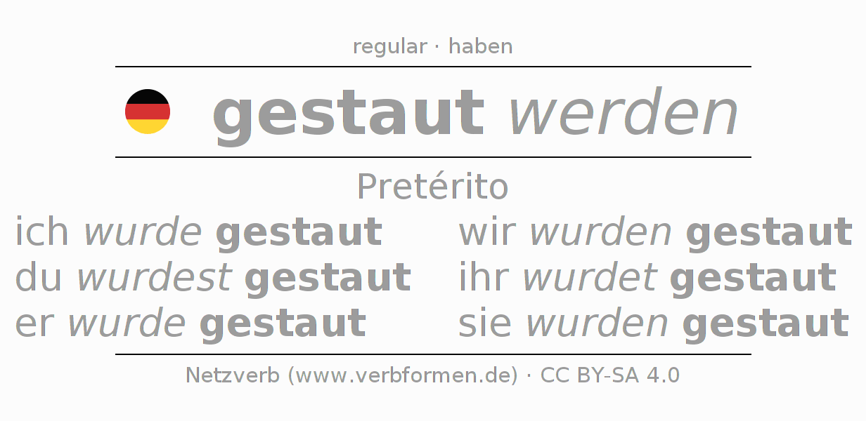 La conjugación de stauen en Pretérito Indicativo Pasado Pasivo procesivo es ich wurde gestaut, du wurdest gestaut, er wurde gestaut, wir wurden gestaut, ihr wurdet gestaut, sie wurden gestaut.Para construir esta formas se requiere seguir algunas reglas gramaticales y también las especificaciones para la conjugación de verbos simples de stauen en Pretérito . Comentarios ☆