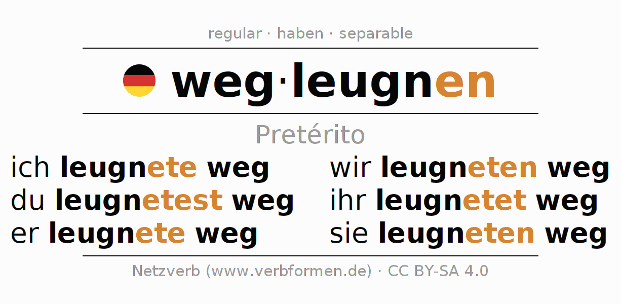 Este verbo wegleugnen (desmentir, negar) se conjuga en pretérito de la siguiente manera: ich leugnete weg, du leugnetest weg, er leugnete weg, wir leugneten weg, ihr leugnetet weg, sie leugneten weg