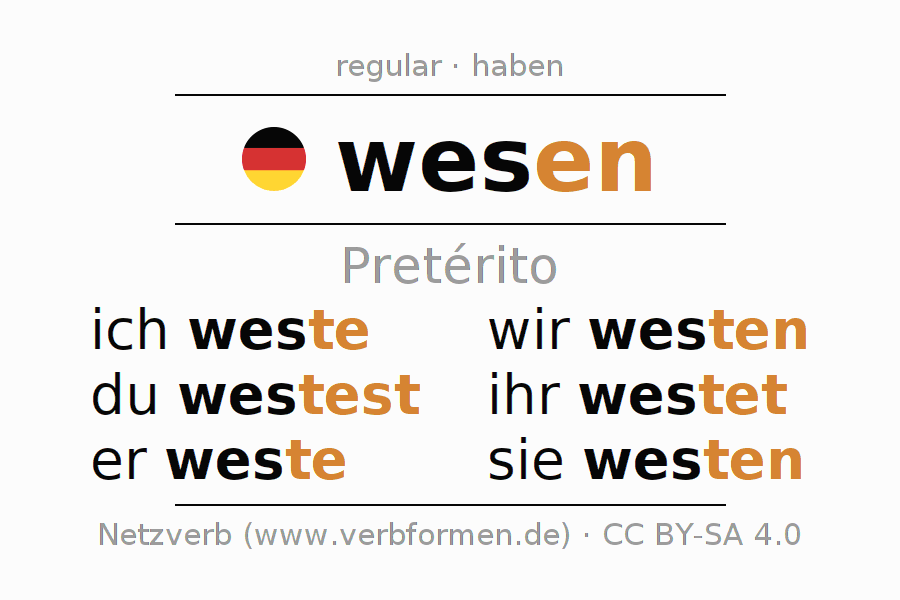 Este verbo wesen (durar, existir) se conjuga en pretérito de la siguiente manera: ich weste, du westest, er weste, wir westen, ihr westet, sie westen