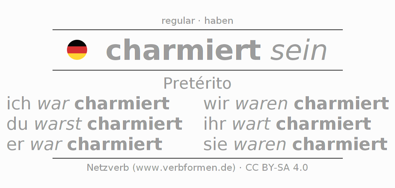 El verbo charmieren, conjugado completamente en todas las personas y números gramaticales en Pretérito Indicativo.