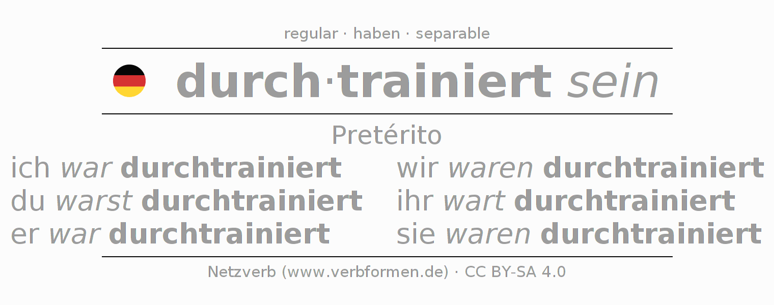 El verbo durchtrainieren, conjugado completamente en todas las personas y números gramaticales en Pretérito Indicativo.