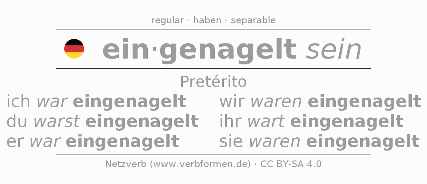 La conjugación de einnageln en Pretérito Indicativo Pasado Pasivo situativo es ich war eingenagelt, du warst eingenagelt, er war eingenagelt, wir waren eingenagelt, ihr wart eingenagelt, sie waren eingenagelt.Para construir esta formas se requiere seguir algunas reglas gramaticales y también las especificaciones para la conjugación de verbos simples de einnageln en Pretérito . Comentarios ☆