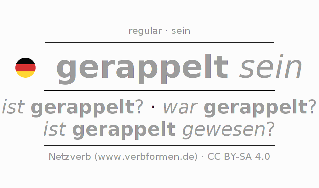 La conjugación de rappeln en Pretérito Indicativo Pasado Pasivo situativo es war ich gerappelt?, warst du gerappelt?, war er gerappelt?, waren wir gerappelt?, wart ihr gerappelt?, waren sie gerappelt?.Para construir esta formas se requiere seguir algunas reglas gramaticales y también las especificaciones para la conjugación de verbos simples de rappeln en Pretérito . Comentarios ☆