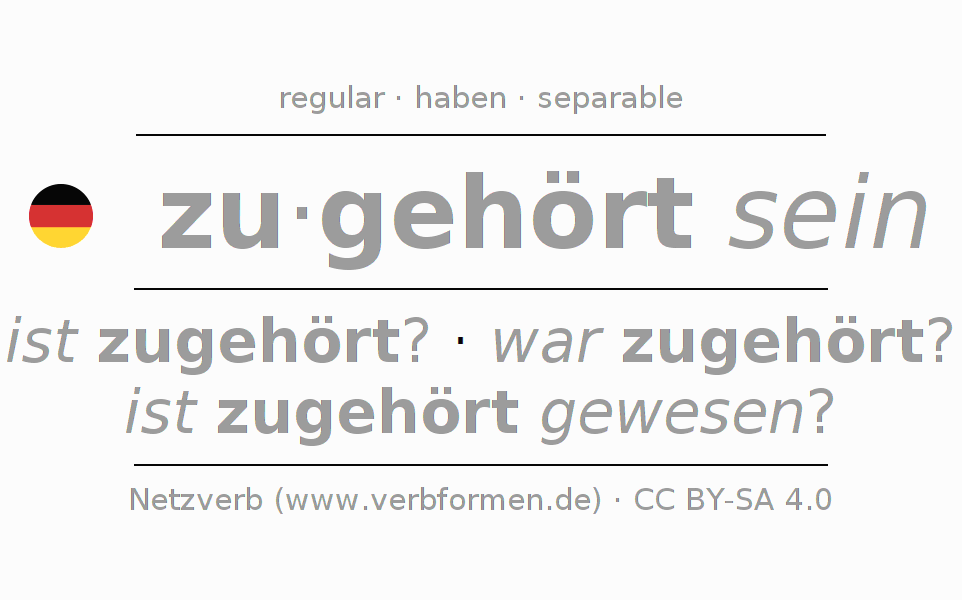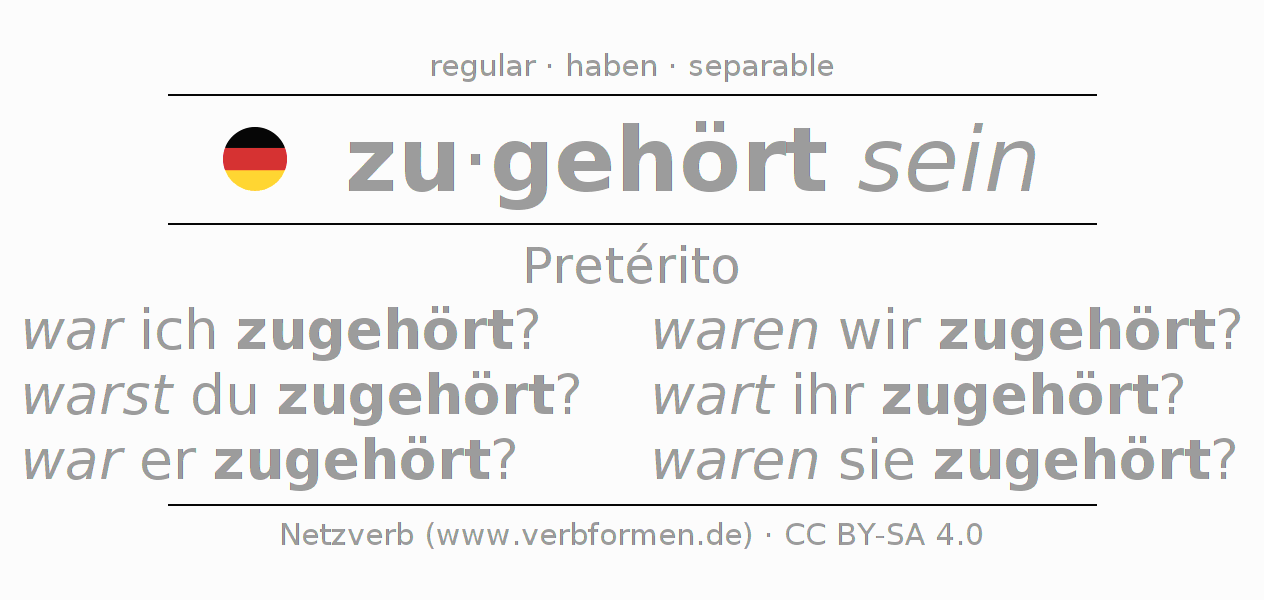 La conjugación de zuhören en Pretérito Indicativo Pasado Pasivo situativo es war ich zugehört?, warst du zugehört?, war er zugehört?, waren wir zugehört?, wart ihr zugehört?, waren sie zugehört?.Para construir esta formas se requiere seguir algunas reglas gramaticales y también las especificaciones para la conjugación de verbos simples de zuhören en Pretérito . Comentarios ☆