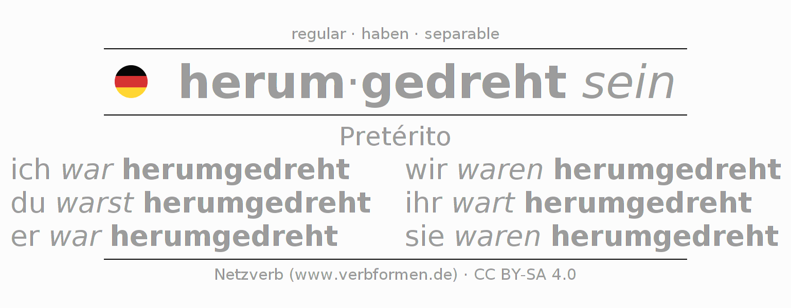 El verbo herumdrehen, conjugado completamente en todas las personas y números gramaticales en Pretérito Indicativo.