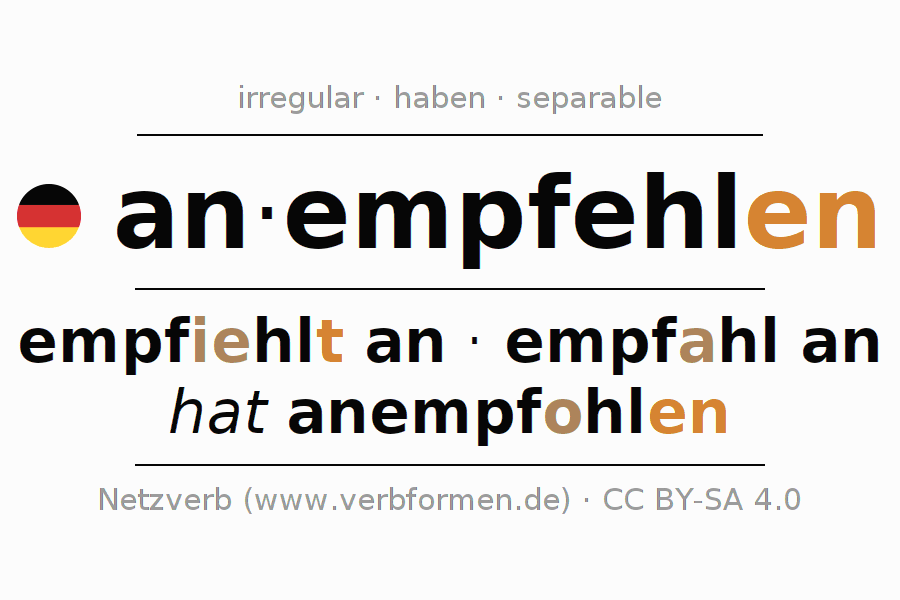El verbo an-empfehlen, conjugado completamente en todas las personas y números gramaticales en Infinitivo Presente Pasado perfecto.