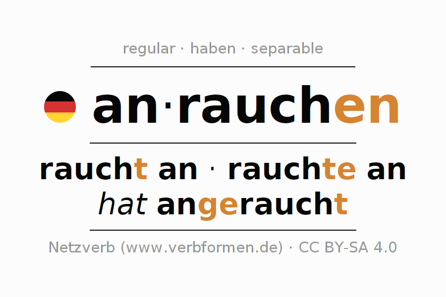 El verbo anrauchen, conjugado completamente en todas las personas y números gramaticales en Infinitivo Presente Pasado perfecto.