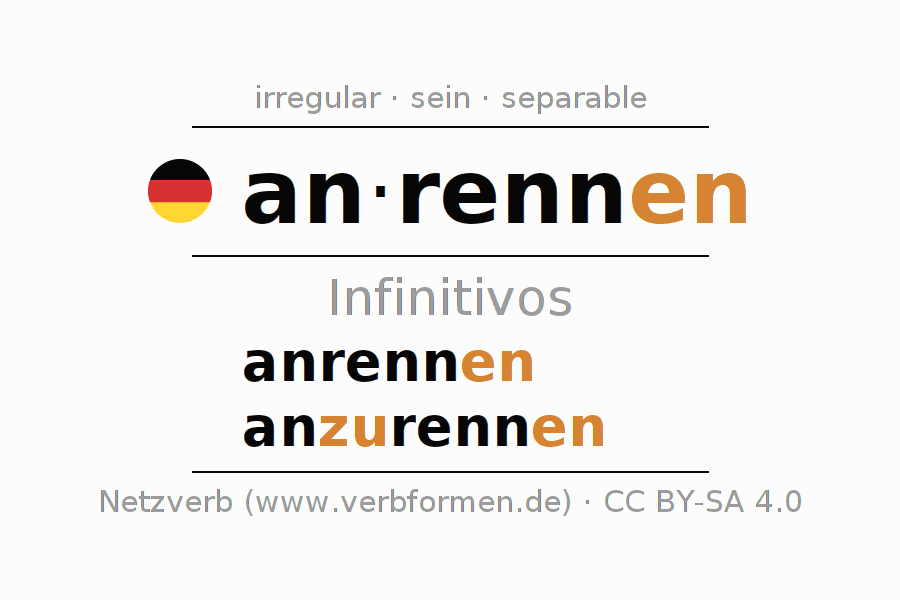 Los infinitivos de anrennen (arremeter contra, chocar) son: anrennen, anzurennen