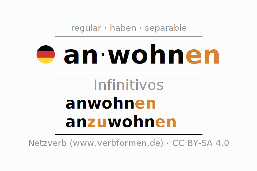 El verbo anwohnen, conjugado completamente en todas las personas y números gramaticales en Infinitivo Presente Pasado perfecto.