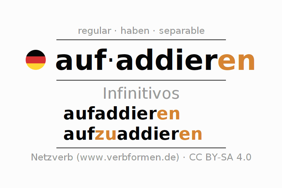 El verbo aufaddieren, conjugado completamente en todas las personas y números gramaticales en Infinitivo Presente Pasado perfecto.