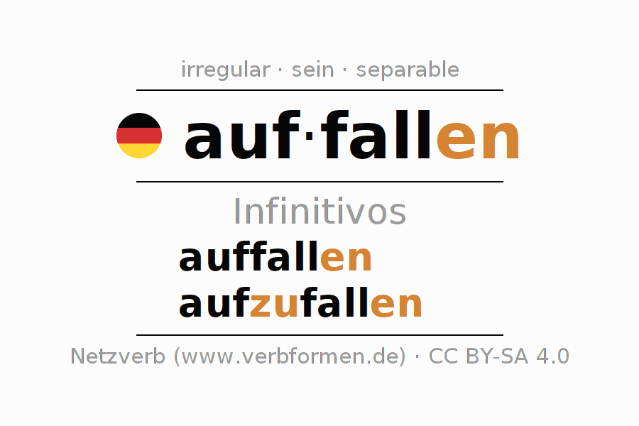 El verbo auffallen, conjugado completamente en todas las personas y números gramaticales en Infinitivo Presente Pasado perfecto.