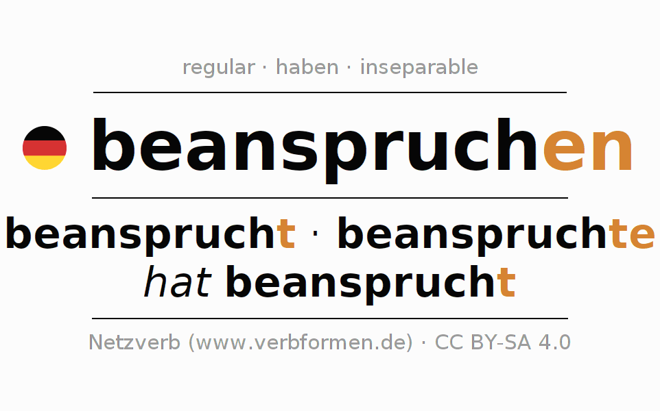 El verbo beanspruchen, conjugado completamente en todas las personas y números gramaticales en Infinitivo Presente Pasado perfecto.