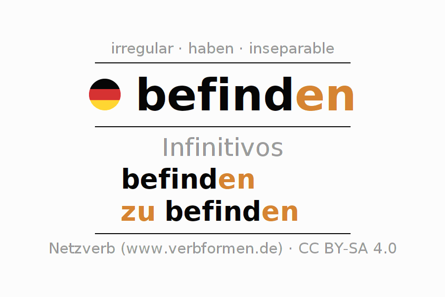 El verbo befinden, conjugado completamente en todas las personas y números gramaticales en Infinitivo Presente Pasado perfecto.