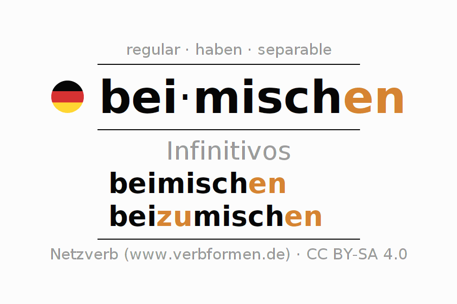 El verbo beimischen, conjugado completamente en todas las personas y números gramaticales en Infinitivo Presente Pasado perfecto.