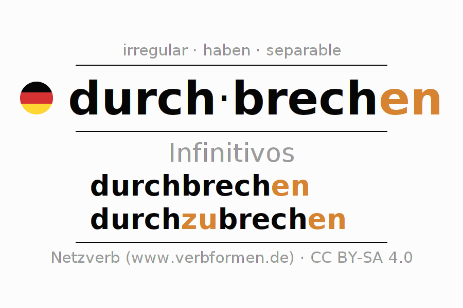 El verbo durch-brechen (hat), conjugado completamente en todas las personas y números gramaticales en Infinitivo Presente Pasado perfecto.