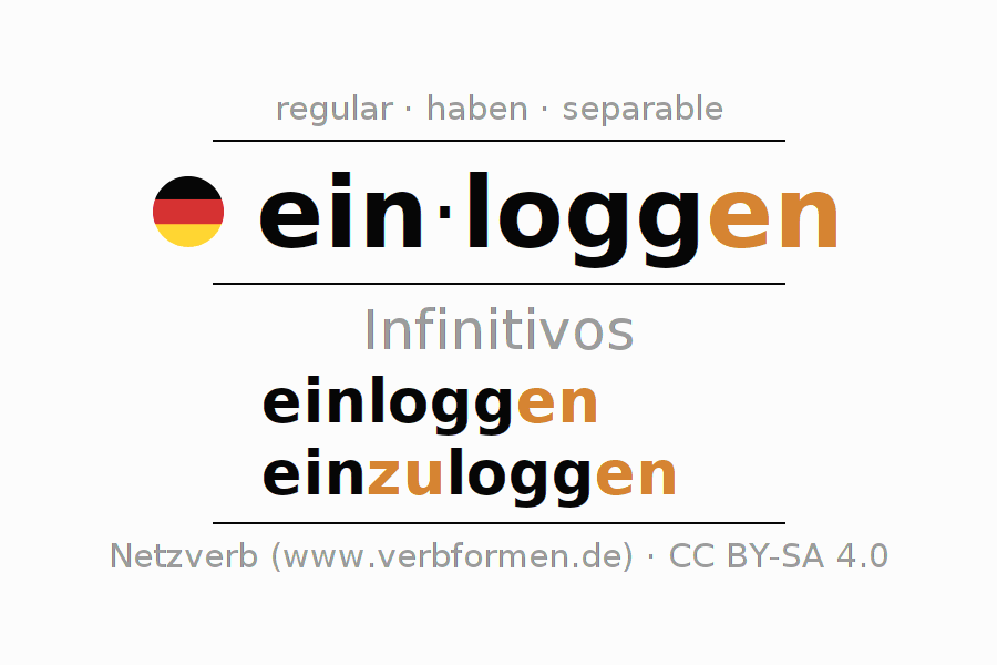 El verbo einloggen, conjugado completamente en todas las personas y números gramaticales en Infinitivo Presente Pasado perfecto.