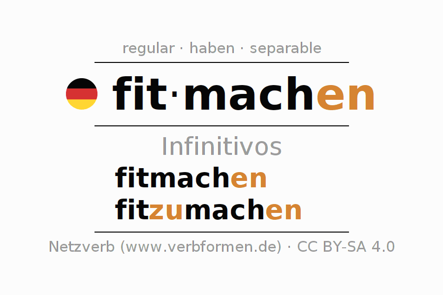 El verbo fitmachen, conjugado completamente en todas las personas y números gramaticales en Infinitivo Presente Pasado perfecto.