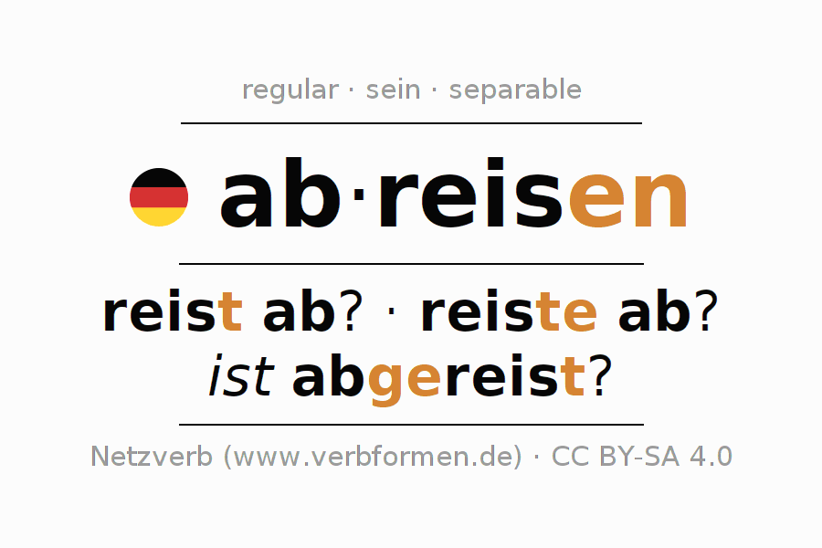 La conjugación de abreisen en Infinitivo Presente Pasado perfecto forma básica Activo es abreisen, abzureisen.Para construir esta formas se requiere seguir algunas reglas gramaticales y también las especificaciones para la conjugación de verbos simples de abreisen en Infinitivo . Comentarios ☆