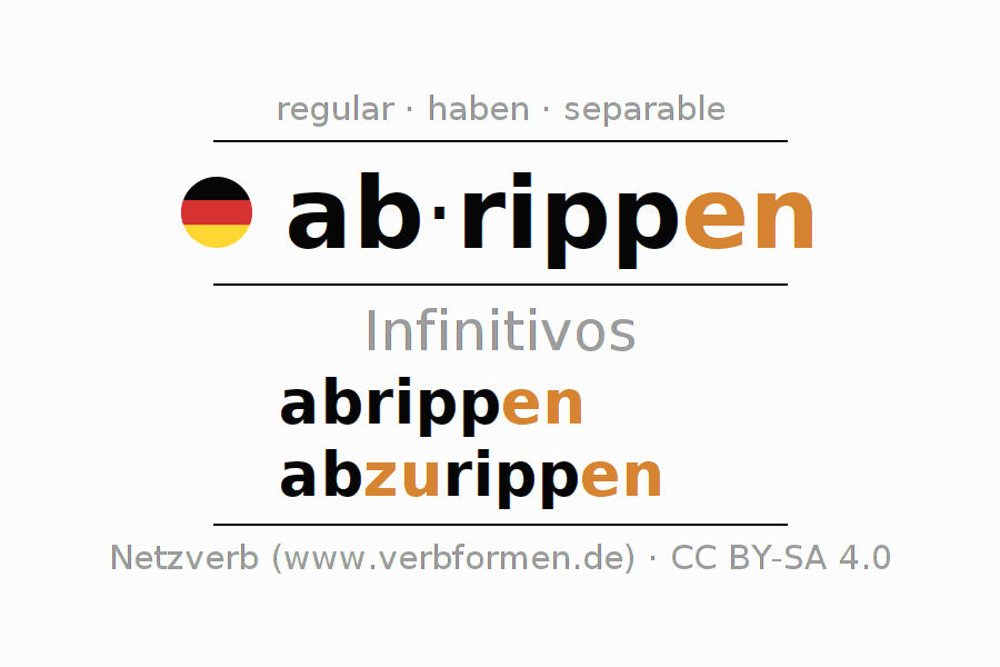 La conjugación de abrippen en Infinitivo Presente Pasado perfecto forma básica Activo es abrippen, abzurippen.Para construir esta formas se requiere seguir algunas reglas gramaticales y también las especificaciones para la conjugación de verbos simples de abrippen en Infinitivo . Comentarios ☆