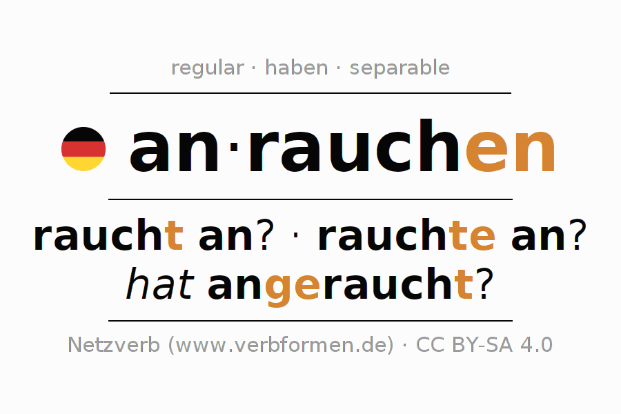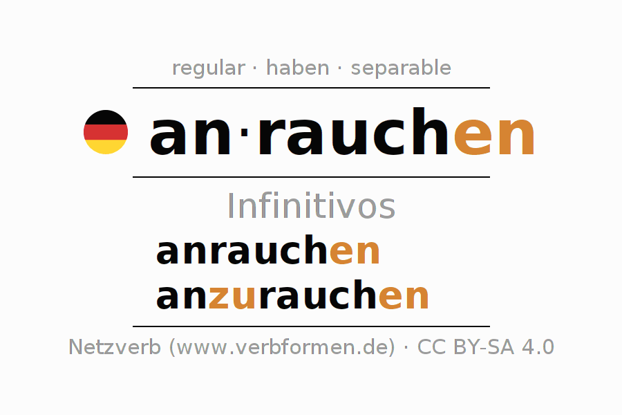 El verbo anrauchen, conjugado completamente en todas las personas y números gramaticales en Infinitivo Presente Pasado perfecto.