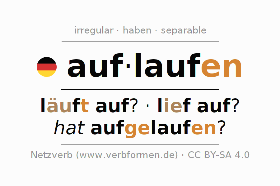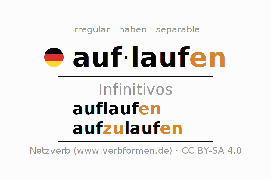 El verbo auflaufen (hat), conjugado completamente en todas las personas y números gramaticales en Infinitivo Presente Pasado perfecto.