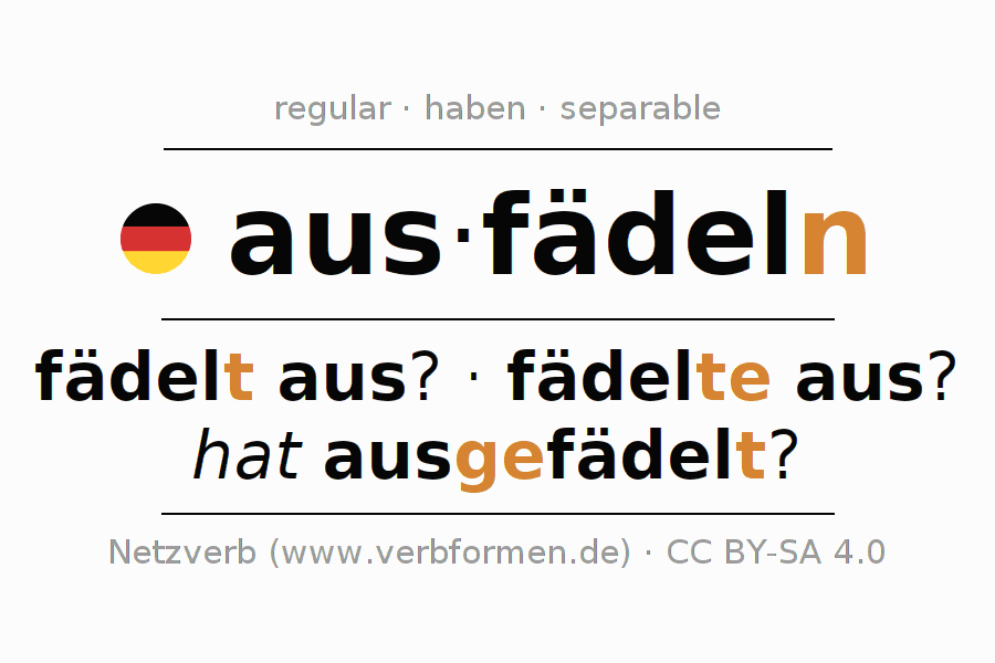 El verbo ausfädeln, conjugado completamente en todas las personas y números gramaticales en Infinitivo Presente Pasado perfecto.