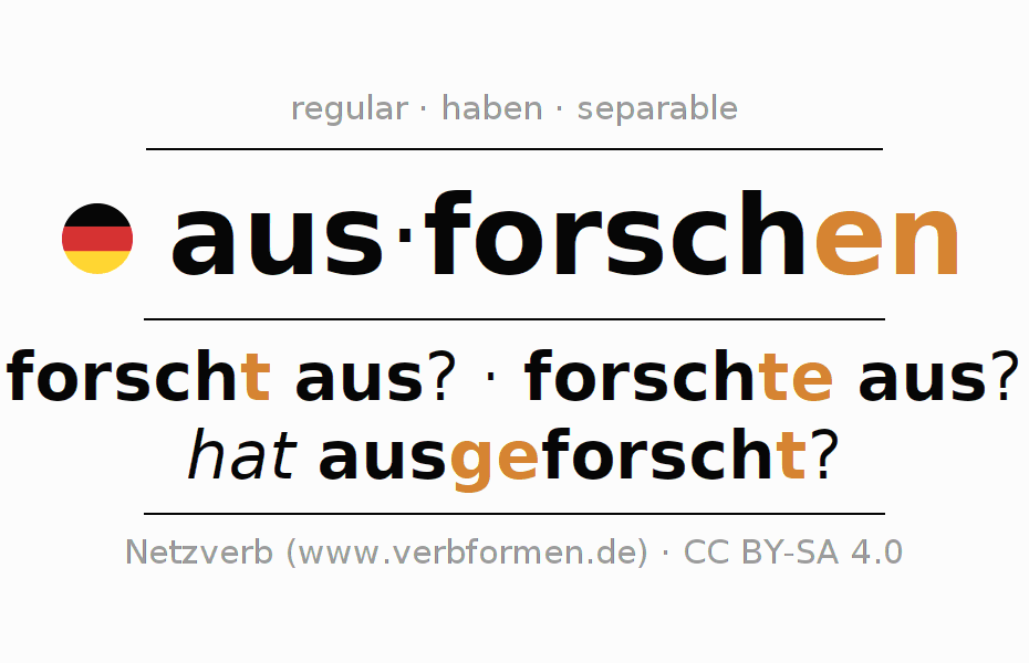 El verbo ausforschen, conjugado completamente en todas las personas y números gramaticales en Infinitivo Presente Pasado perfecto.