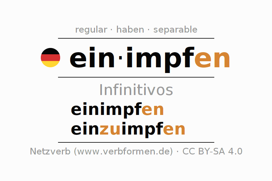 El verbo einimpfen, conjugado completamente en todas las personas y números gramaticales en Infinitivo Presente Pasado perfecto.