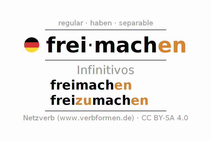 El verbo freimachen, conjugado completamente en todas las personas y números gramaticales en Infinitivo Presente Pasado perfecto.