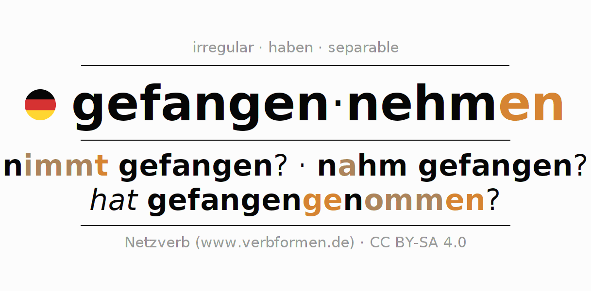 El verbo gefangennehmen, conjugado completamente en todas las personas y números gramaticales en Infinitivo Presente Pasado perfecto.