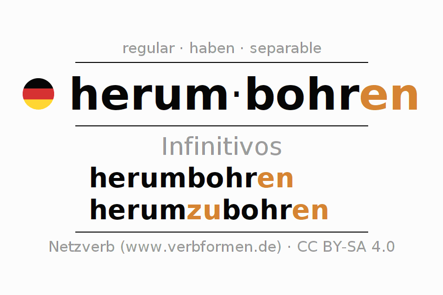 El verbo herumbohren, conjugado completamente en todas las personas y números gramaticales en Infinitivo Presente Pasado perfecto.