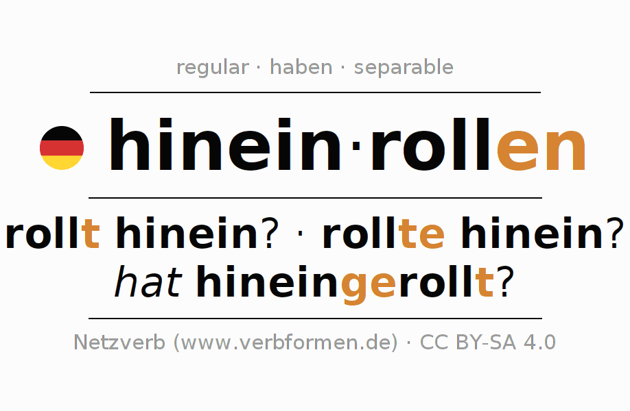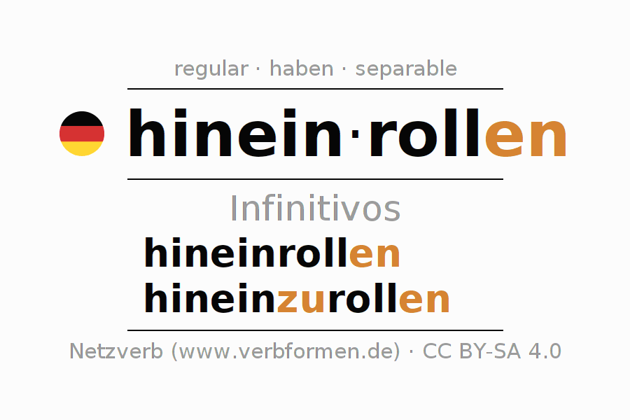 El verbo hineinrollen (hat), conjugado completamente en todas las personas y números gramaticales en Infinitivo Presente Pasado perfecto.