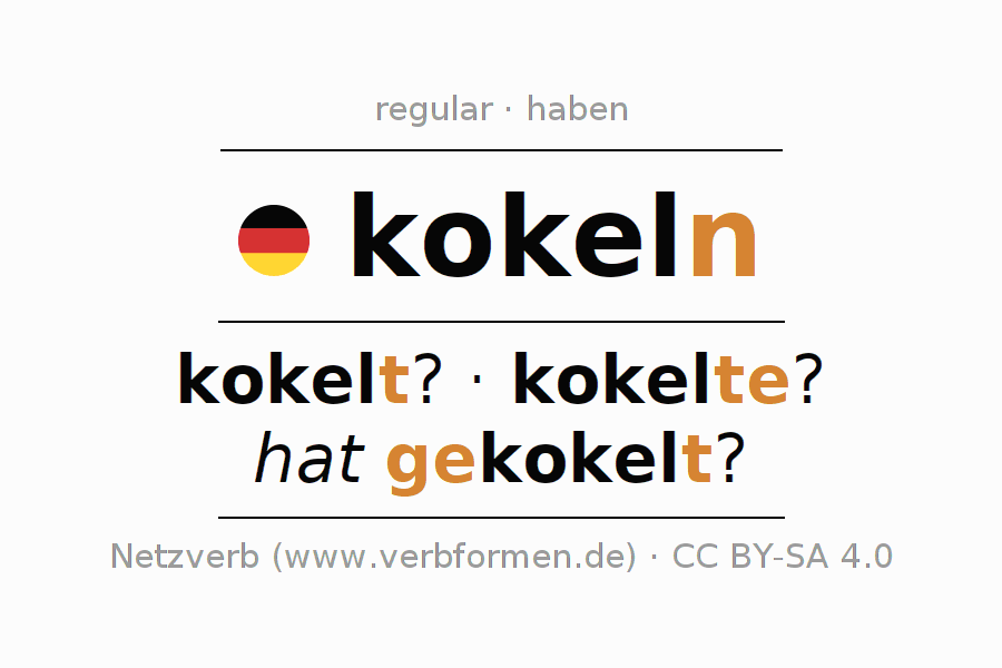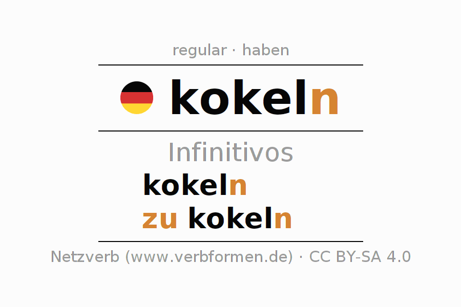 El verbo kokeln, conjugado completamente en todas las personas y números gramaticales en Infinitivo Presente Pasado perfecto.