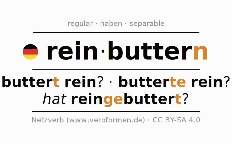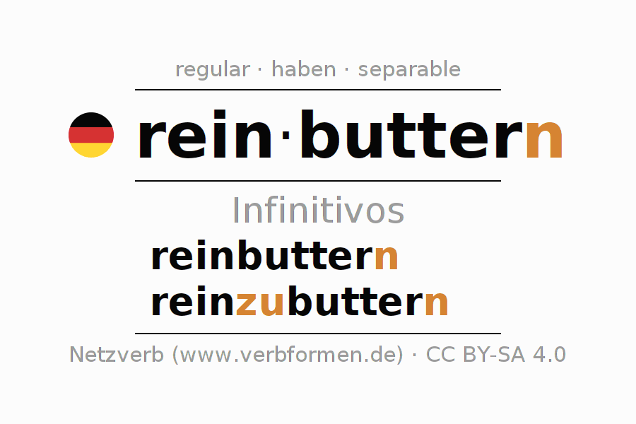 El verbo reinbuttern, conjugado completamente en todas las personas y números gramaticales en Infinitivo Presente Pasado perfecto.