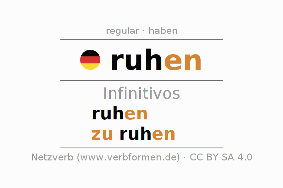 El verbo ruhen, conjugado completamente en todas las personas y números gramaticales en Infinitivo Presente Pasado perfecto.