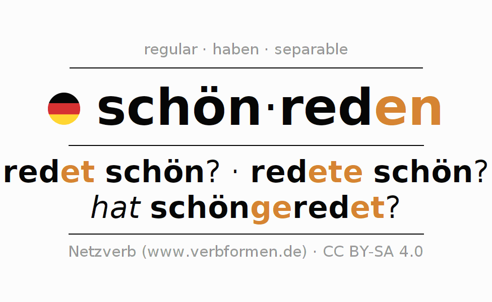 El verbo schönreden, conjugado completamente en todas las personas y números gramaticales en Infinitivo Presente Pasado perfecto.