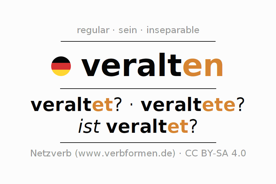 El verbo veralten, conjugado completamente en todas las personas y números gramaticales en Infinitivo Presente Pasado perfecto.