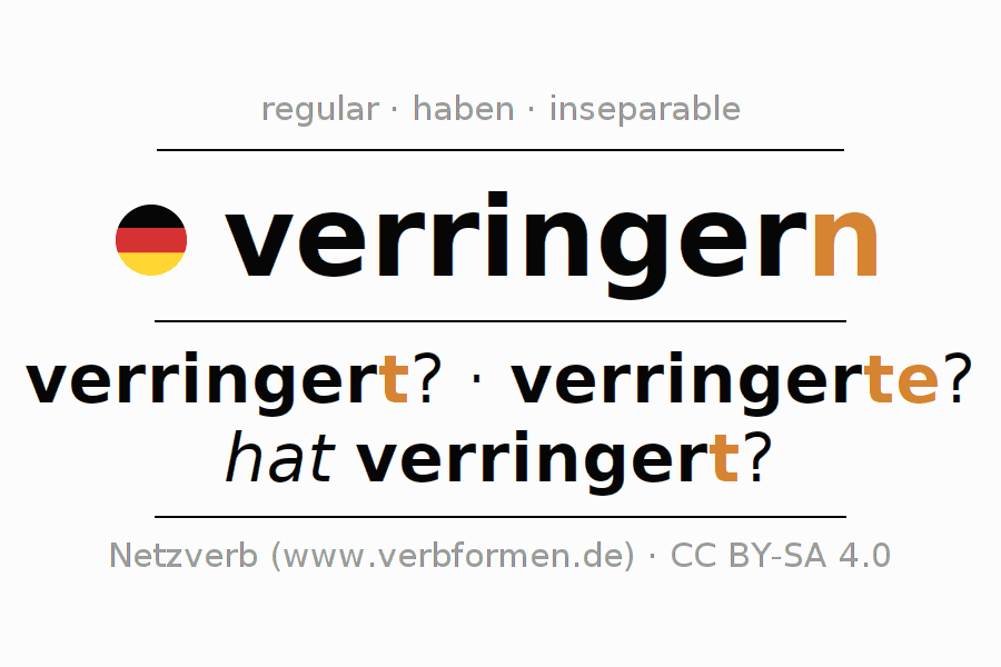El verbo verringern, conjugado completamente en todas las personas y números gramaticales en Infinitivo Presente Pasado perfecto.