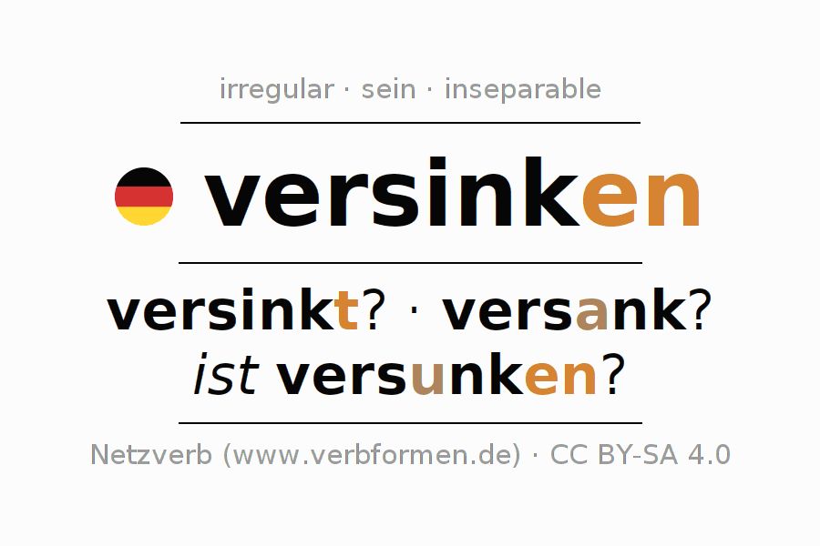 El verbo versinken, conjugado completamente en todas las personas y números gramaticales en Infinitivo Presente Pasado perfecto.