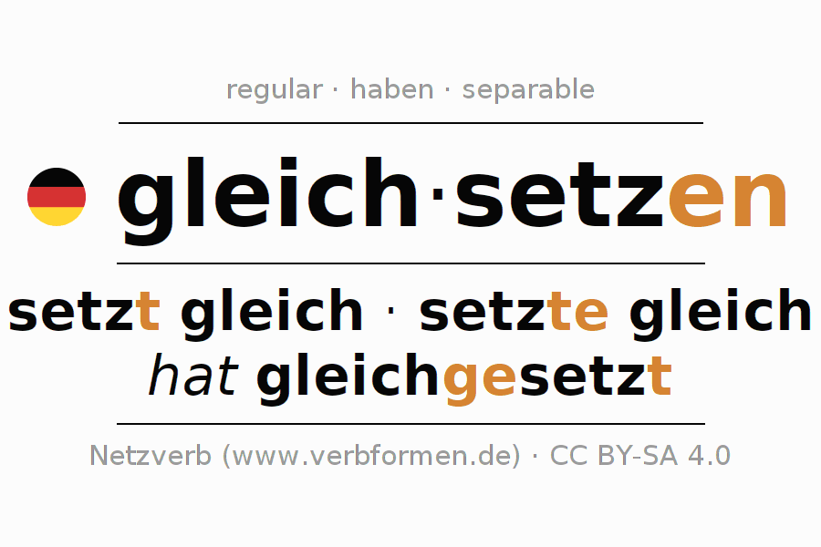 El verbo gleichsetzen, conjugado completamente en todas las personas y números gramaticales en Infinitivo Presente Pasado perfecto.