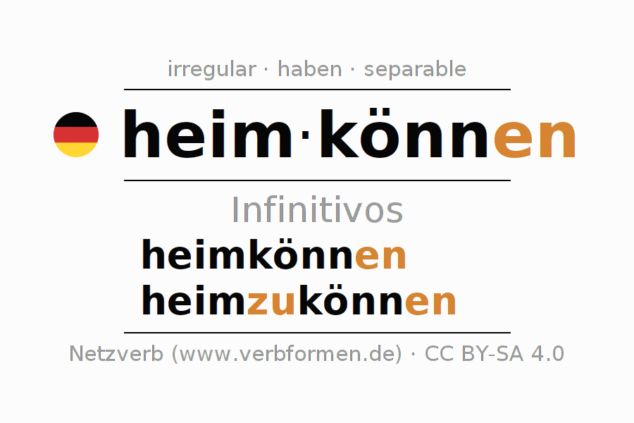 El verbo heimkönnen, conjugado completamente en todas las personas y números gramaticales en Infinitivo Presente Pasado perfecto.