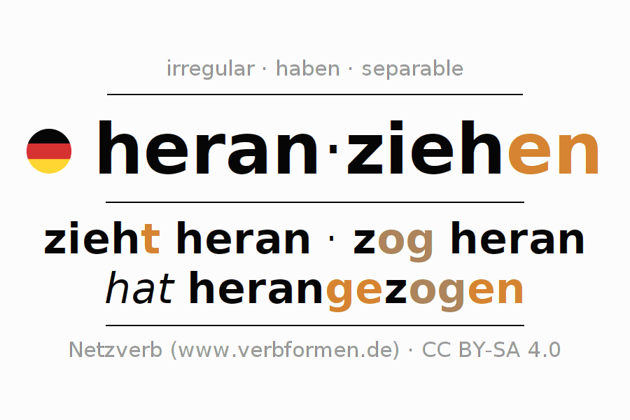 El verbo heranziehen, conjugado completamente en todas las personas y números gramaticales en Infinitivo Presente Pasado perfecto.