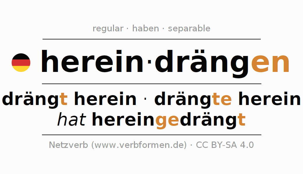 El verbo hereindrängen, conjugado completamente en todas las personas y números gramaticales en Infinitivo Presente Pasado perfecto.