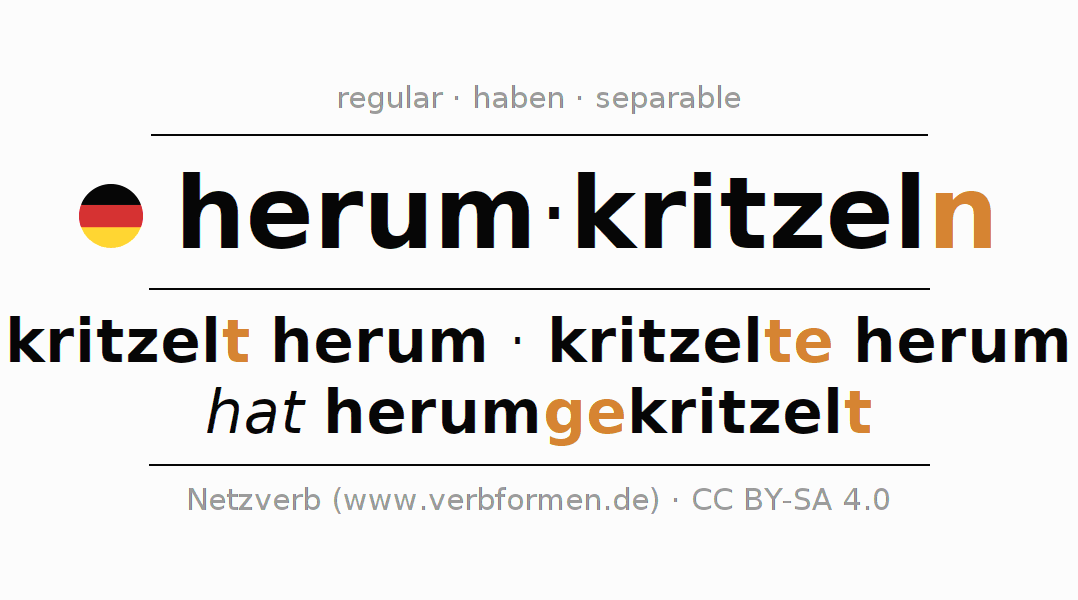 El verbo herumkritzeln, conjugado completamente en todas las personas y números gramaticales en Infinitivo Presente Pasado perfecto.
