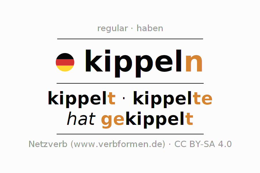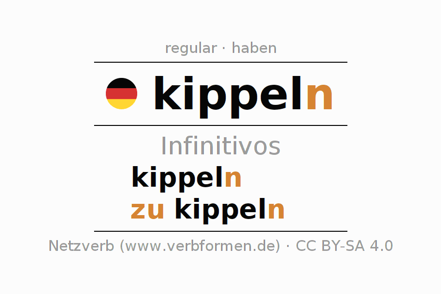 El verbo kippeln, conjugado completamente en todas las personas y números gramaticales en Infinitivo Presente Pasado perfecto.